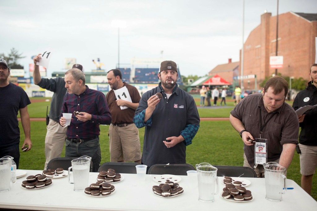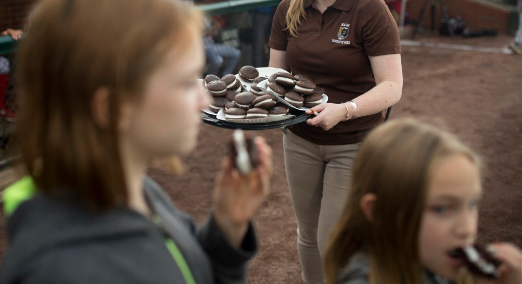 Before the game, a whoopie pie eating contest took place in front of the visitors’ dugout.