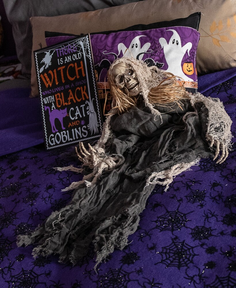 Dracula and Frankenstein. Couch pillows feature witches and zombies. A life-size mechanical witch, brought to life by motion sensor, shares a conversation with a raven.