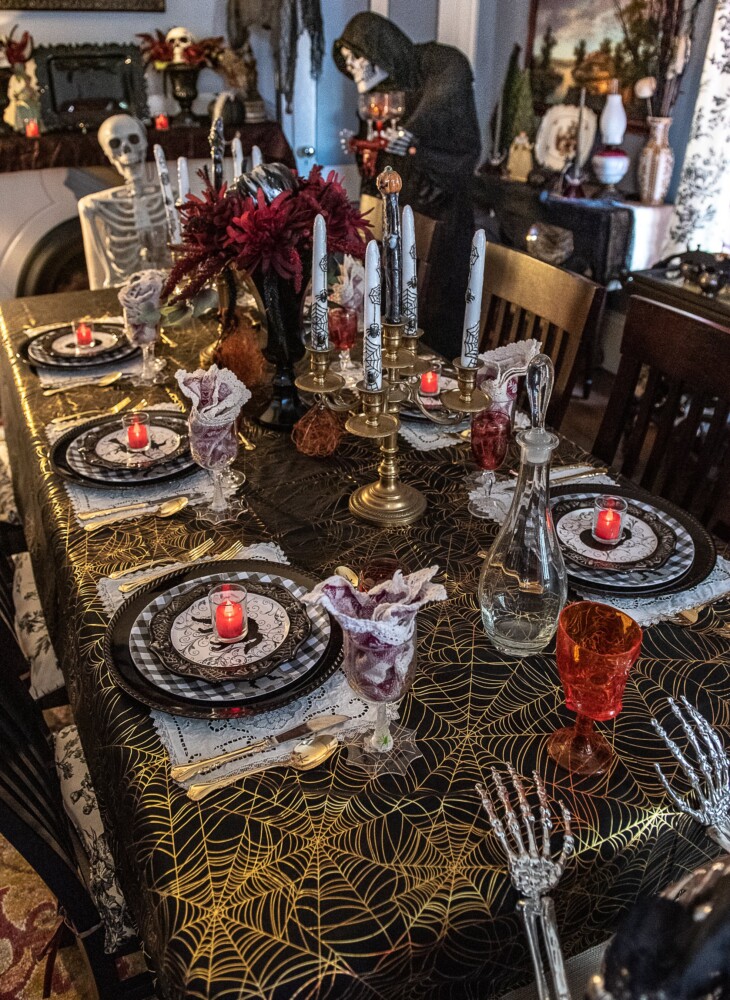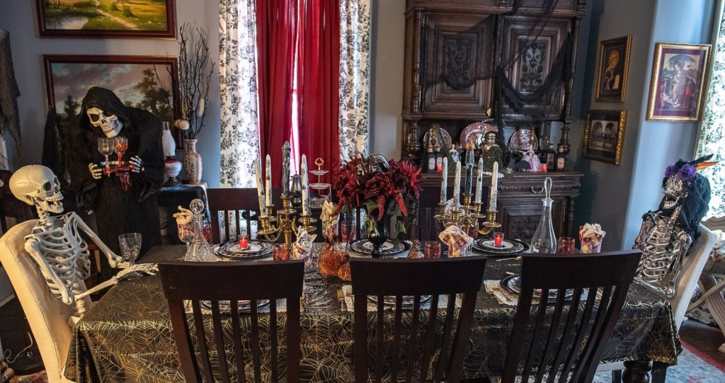 The adjacent dining room table is set with black cat plates, blood-red goblets, candles with spider webs and spiders. Smiling skeletons sit at both ends of the table while waiting for service from the Grim Reaper.