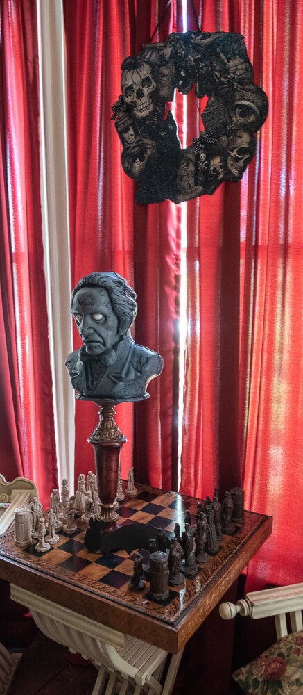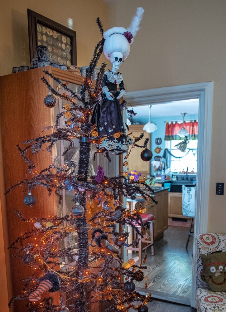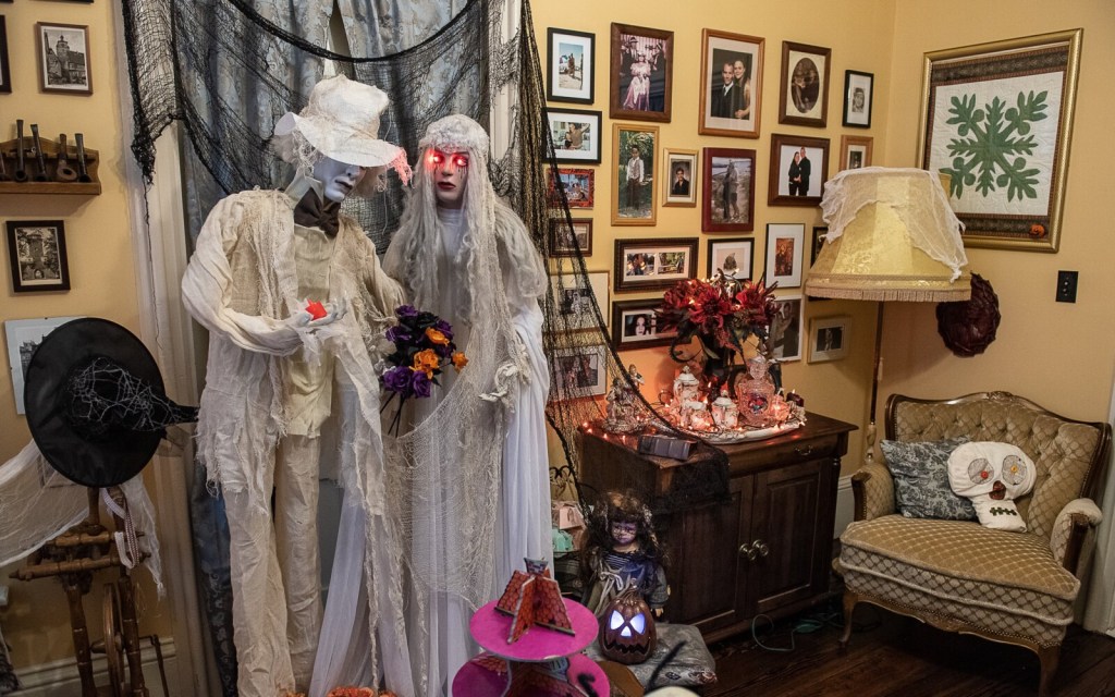 The Gothic revival home is spooked out with Halloween goblins, mirrors that tell visitors to “go back,” a Grim Reaper serving drinks in the dining room. There’s a Halloween Christmas tree that sways to and fro as it emits creepy sounds. The tree’s branches are as black as ravens, the tree is topped with a ghost, of course.