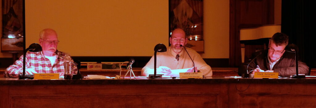 Rumford Selectman Peter Chase, left, Town Manager Stacy Carter, center, and Selectman Mark Belanger attend Thursday night’s board meeting. Bruce Farrin/Rumford Falls Times
