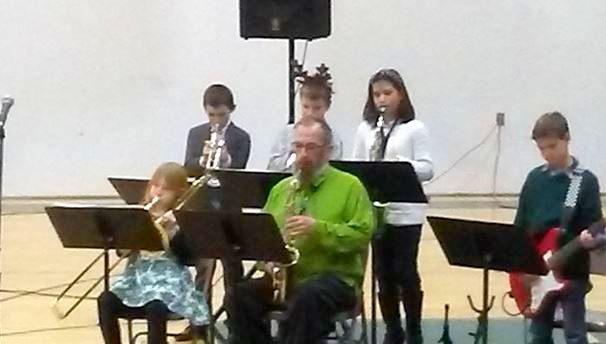 The Six Musketeers: Students from 4,5 and 6 grades including; Addie Zietz on trombone, Eben Laliberte on trumpet, Troy Hathaway on trumpet, Avarie Gordon on saxophone, Dylan LeMay on bass guitar, and director Mike Schrader on saxophone. Jennifer Stout