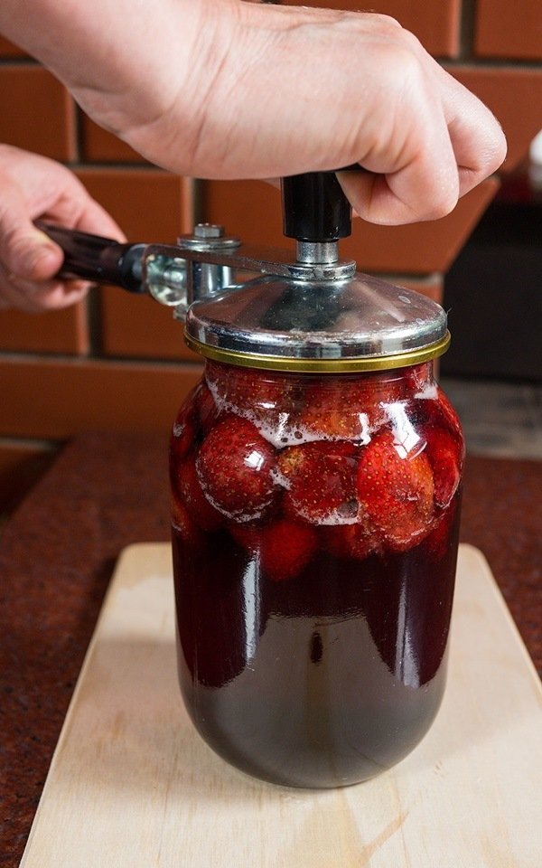 Ukrainian Canning Jar: A lid is being secured to a jar of plums and juice with a device called a key.