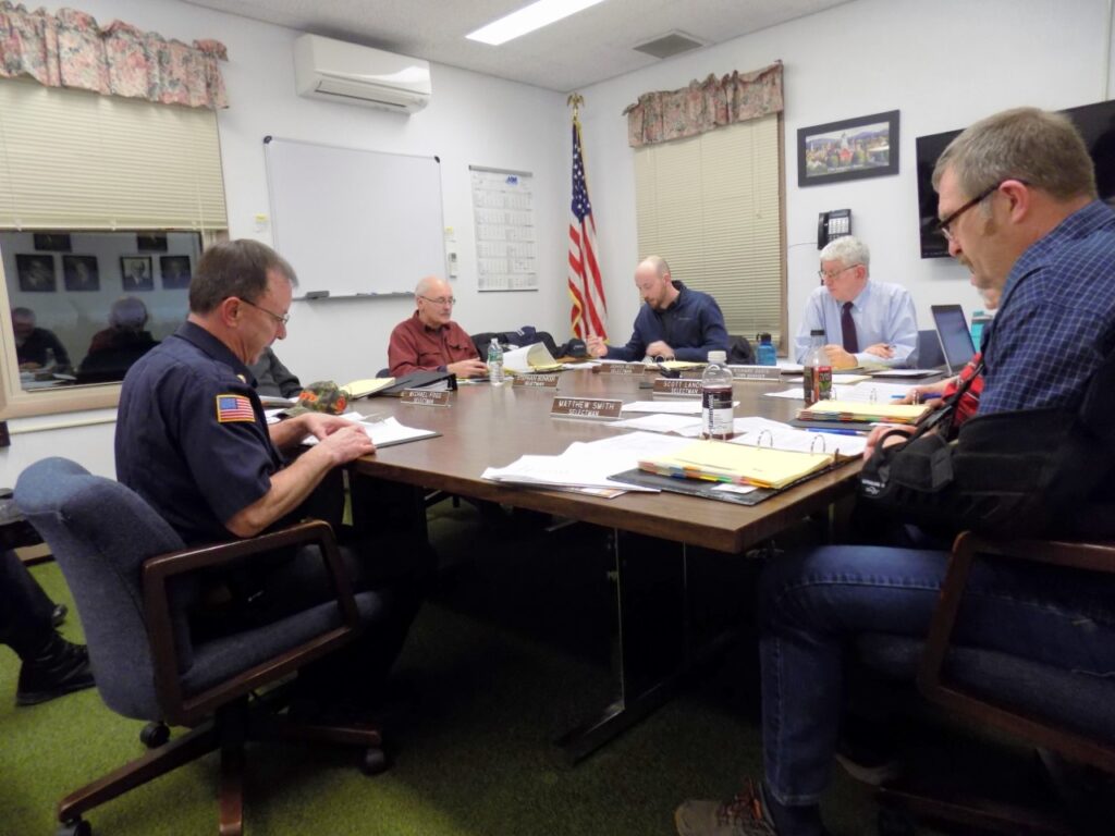 Tuesday department heads shared their proposed 2020 budgets with the Farmington Board of Selectmen. Farmington Fire Rescue Acting Chief Tim Hardy at left talked about adding more staff. Also pictured from left are Selectmen Stephan Bunker and Joshua Bell, Town Manager Richard Davis and Selectman Matthew Smith. Selectmen Michael Fogg and Scott Landry are hidden. Pam Harnden/Livermore Falls Advertiser
