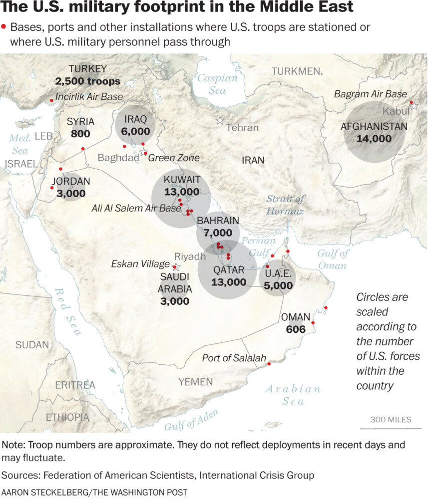 The United States has tens of thousands of military personnel at bases and aboard ships across the Middle East, as well as arrangements with various countries to move soldiers and military equipment through airstrips and ports. Here’s a look at some of these places, which could now be targets.