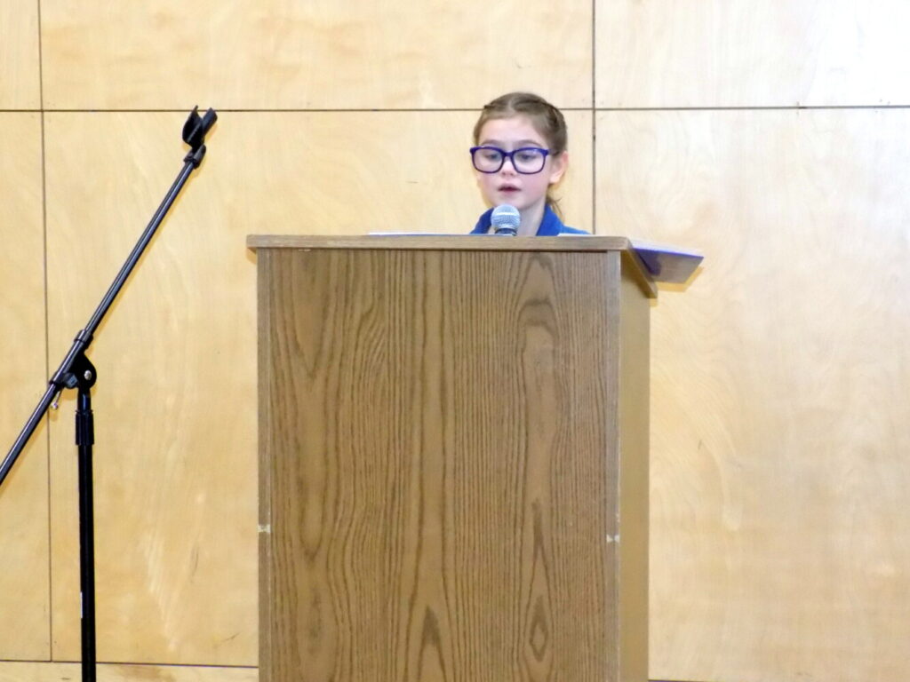 Spruce Mountain Primary and Elementary schools will have Buddy Benches to help students know when classmates are looking for a friend or want to play a different game. Summit Woodcock of Livermore discussed the benches she raised funds for Monday, Jan. 13 during an assembly at Spruce Mountain Primary School. Pam Harnden/Livermore Falls Advertiser
