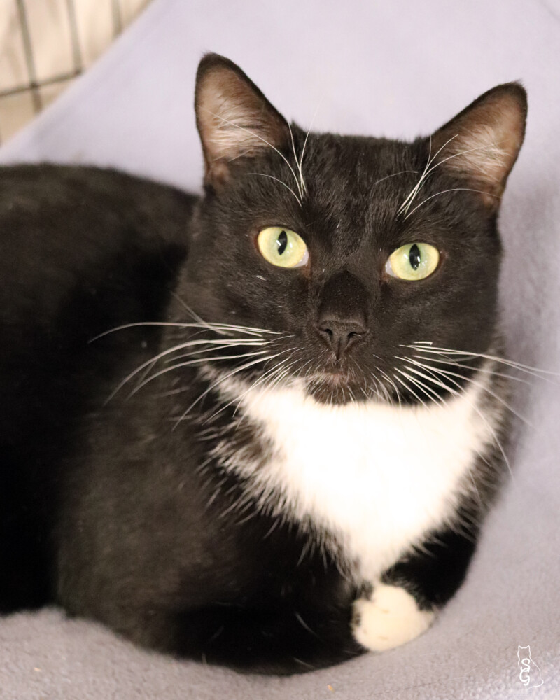 Edgar is five years old. His black fur with the white bib makes him a tuxedo kitty.  His friendly personality makes him a pleasure to have around.