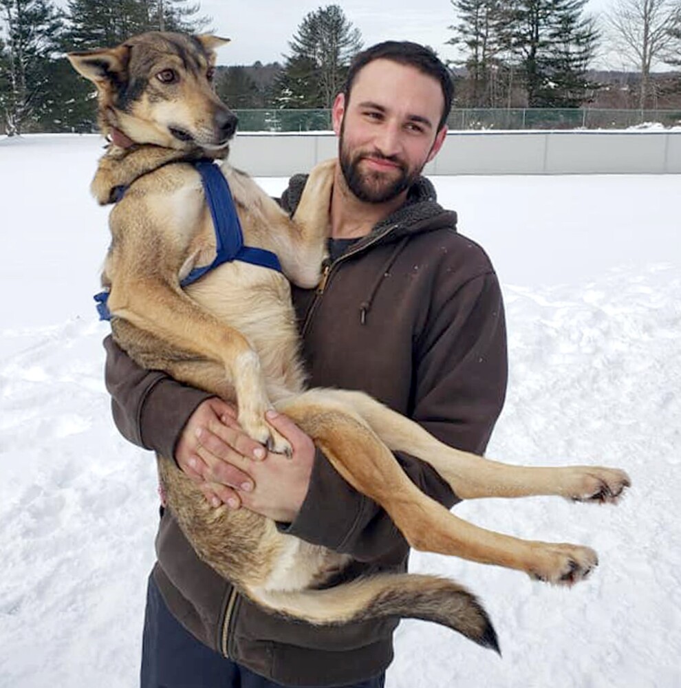 Alexander Therriault holds his Alaskan husky, Misty, who is the official “greeter” who loves to be picked up and to play with customers waiting to go for a sled ride. Submitted photo
