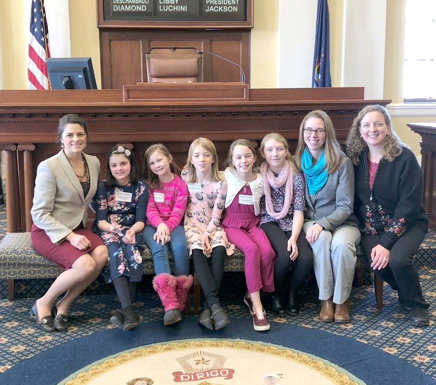 Students from Crescent Park School in Bethel served as honorary pages in the Maine State Senate on Jan 30, 2020. Pictured (l to r) are: Senator Lisa Keim, Gabby Doyon, Cecilia Ross, Cody-Ann Scanlon, Isia DeCato, Parker Gilman, Sarah DeCato, and Mary Scanlon. Submitted photo