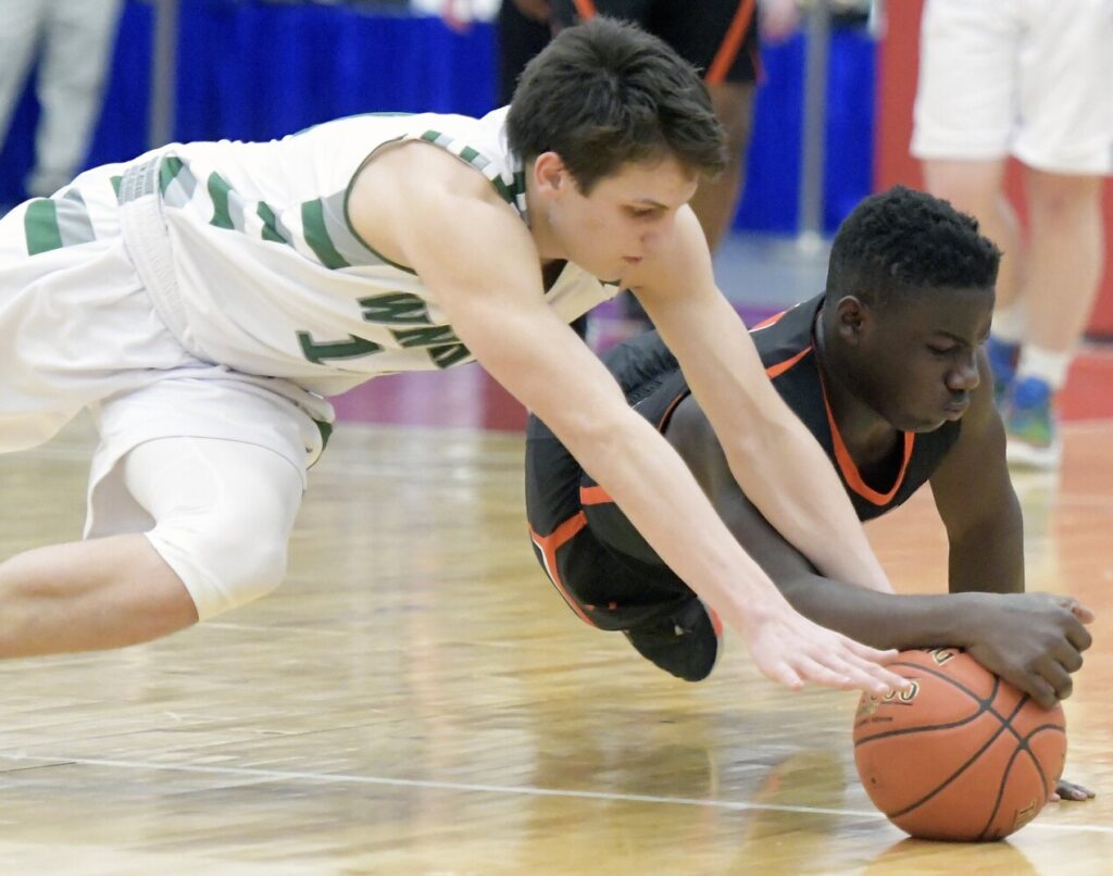 Winthrop’s Ian Steele, left, dives on the ball with North Yarmouth Academy’s Jacquim Bila during a Class C South semifinal game Thursday night at the Augusta Civic Center. Kennebec Journal photo by Andy Molloy Buy this Photo