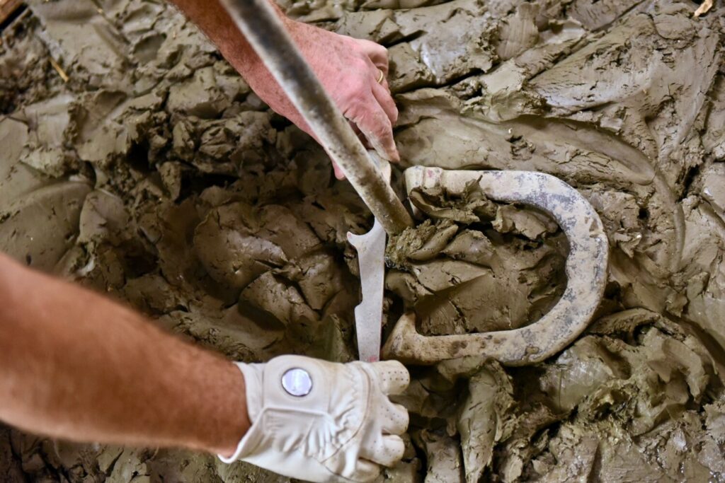 Providing a tour of the pits, Ritchie insists that the reporter throw a couple horseshoes just to prove he belongs. When the reporter complies and metal hits metal, dozens of onlookers cheer loudly.