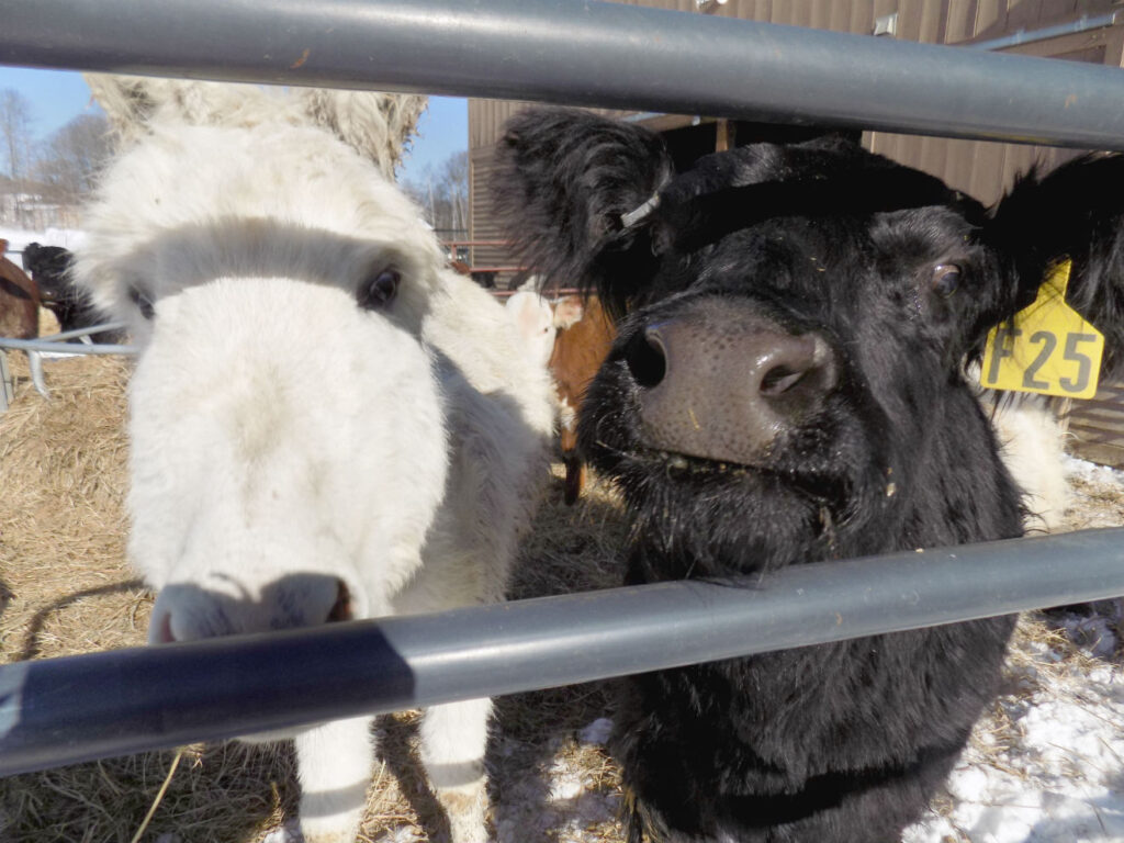 A Belted Galloway at Colby Woods Cattle Farm in Jay pushes past a donkey for attention from a visitor on Friday, Feb. 21. Pam Harnden/Livermore Falls Advertiser Buy this Photo