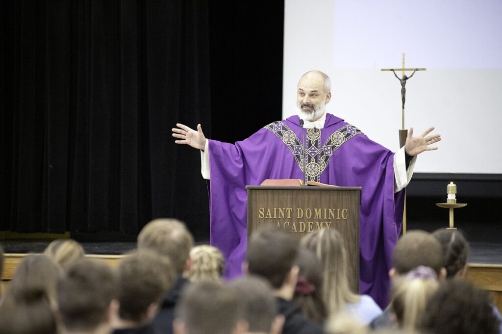 The Rev. Seamus Griesbach celebrates Ash Wednesday during mass at Saint Dominic Academy in Auburn on Wednesday. Griesbach’s teachings included a story of building a fort with young children, which he said reminded him how spending time alone in one’s own “refuge, sanctuary or fort” allows people to get away from today’s constant pressure that is heightened by use of social media and cellphones. “Nice happy fort time without distractions and out of the spotlight,” Griesbach told the students. Daryn Slover/Sun Journal Buy this Photo