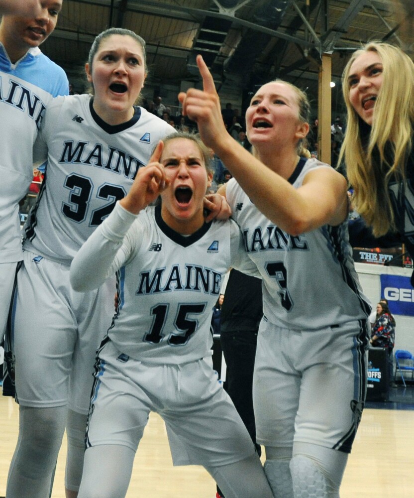 University of Maine women’s basketball players celebrate during their America East semifinal win over UMass-Lowell on Sunday in Orono. The Black Bears have advanced to the conference final for the fifth consecutive year. Morning Sentinel photo by Rich Abrahamson Buy this Photo
