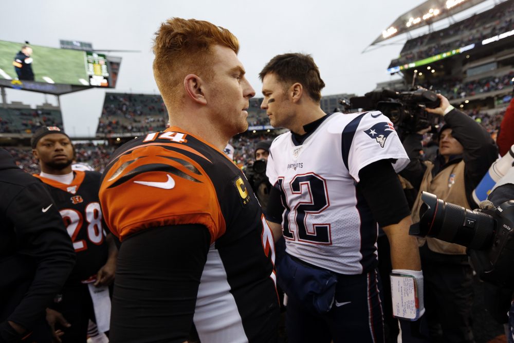 Cincinnati Bengals quarterback Andy Dalton, left, and New England Patriots quarterback Tom Brady (12) meet on the field after an NFL football game in December 2019 in Cincinnati. AP Photo/Frank Victores