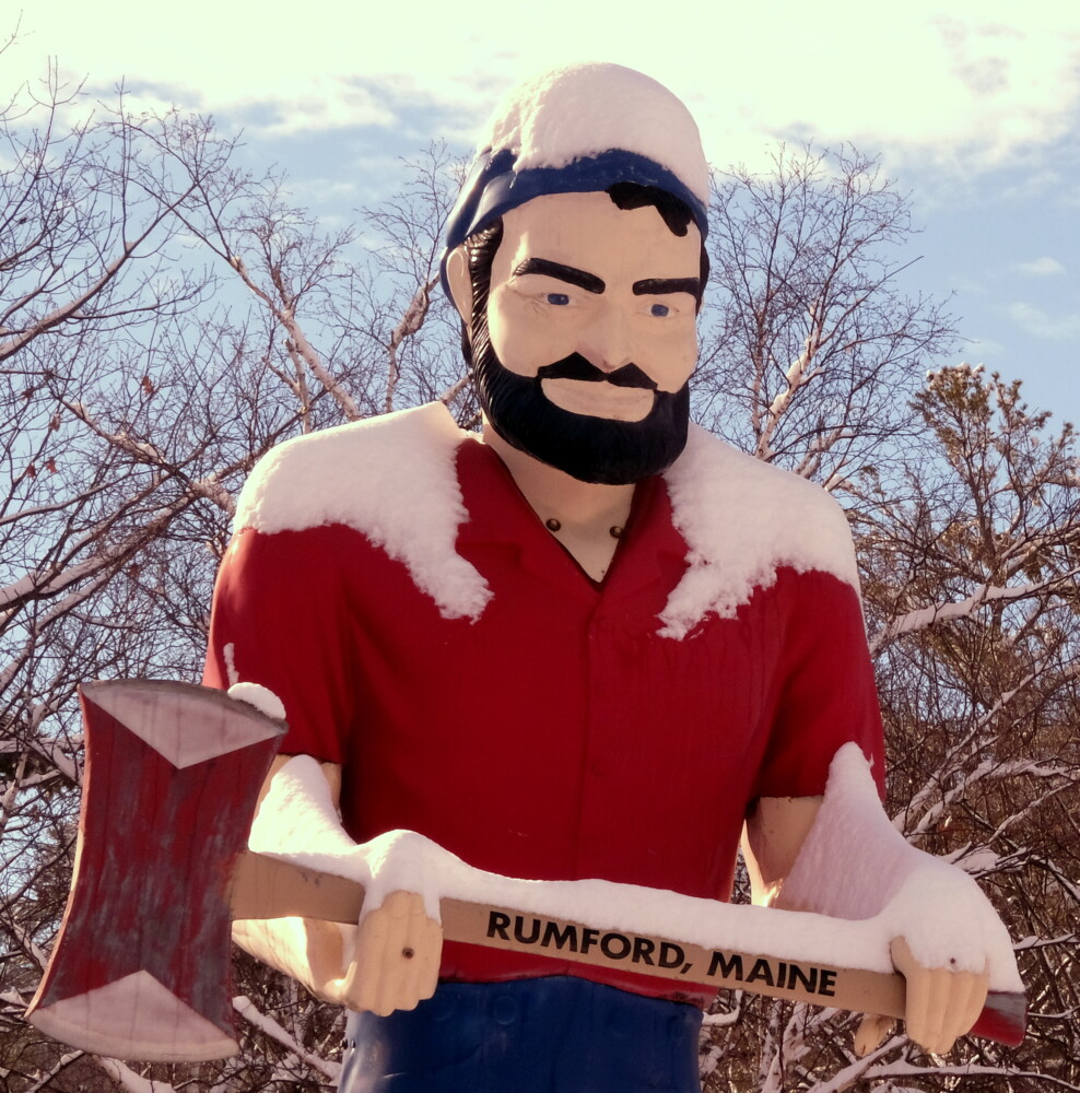 A spring snowstorm that covered the statue of Paul Bunyan in Rumford on Monday night was followed by bright skies and warm temperatures Tuesday, melting the flakes. Bruce Farrin/Rumford Falls Times