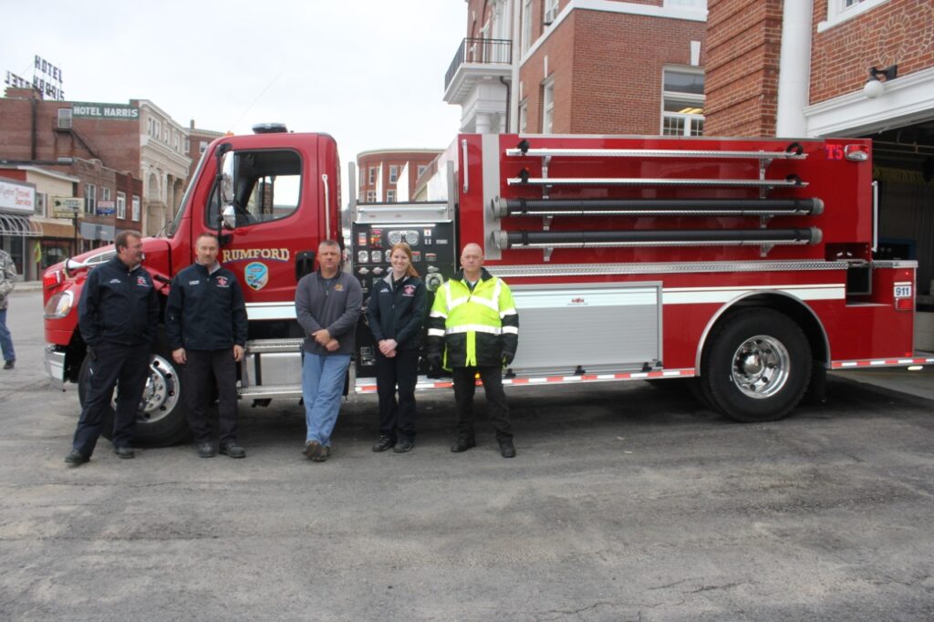 Rumford Fire Department’s new pumper/tanker is shown by, from left, Deputy Chief Rob Dixon, Lt. Keith Bickford, Deputy Chief Chris Bryant, firefighter Sam Cote and Fire Chief Chris Reed. Lou Marin photo