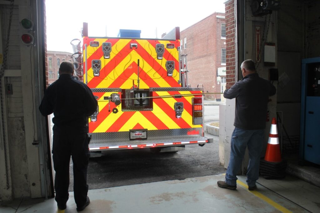Rumford Deputy Fire Chiefs Rob Dixon and Chris Bryant measure the fire station door for clearance for the department’s new pumper/tanker. Lou Marin photo