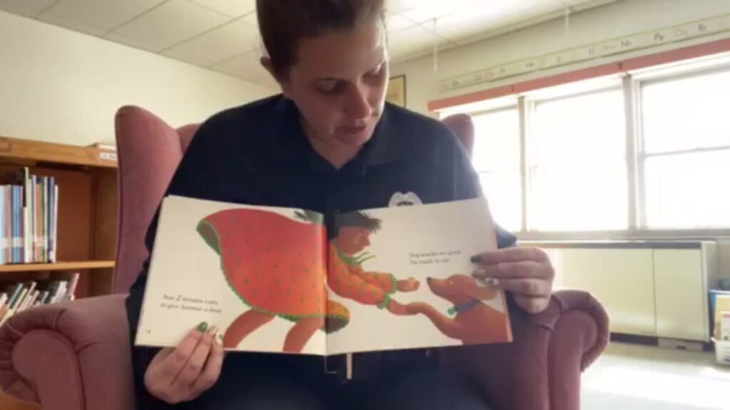 Guy E. Rowe School Resource Officer Christina Sugars reads a picture book to children K-3 on the school’s Facebook page as a way to stay connected to student while schools are closed.
