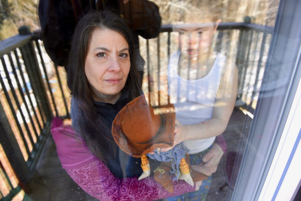 Aranka Matolcsy is self-isolating in West Paris with her son, Colby, 8. They are seen through the sliding glass door at their house. Andree Kehn/Sun Journal Buy this Photo
