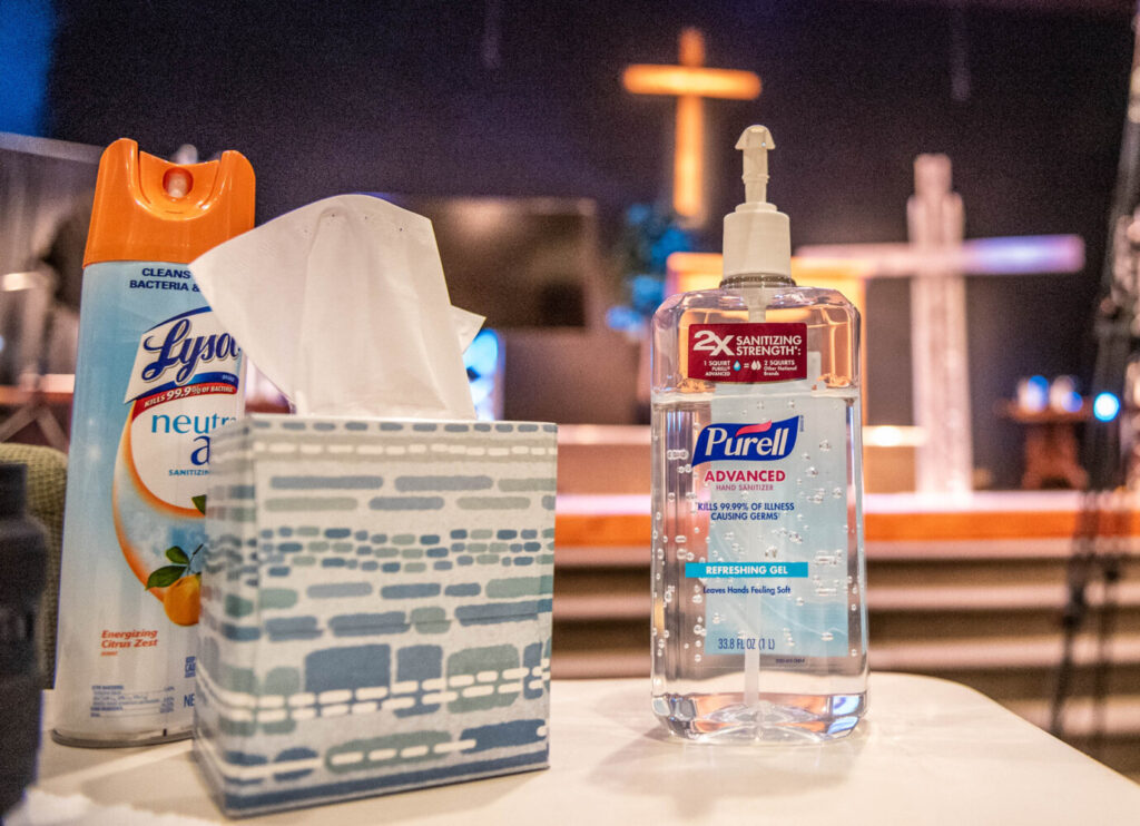 Disinfectant is at the ready in the chapel of the East Auburn Baptist Church. Andree Kehn/Sun Journal Buy this Photo