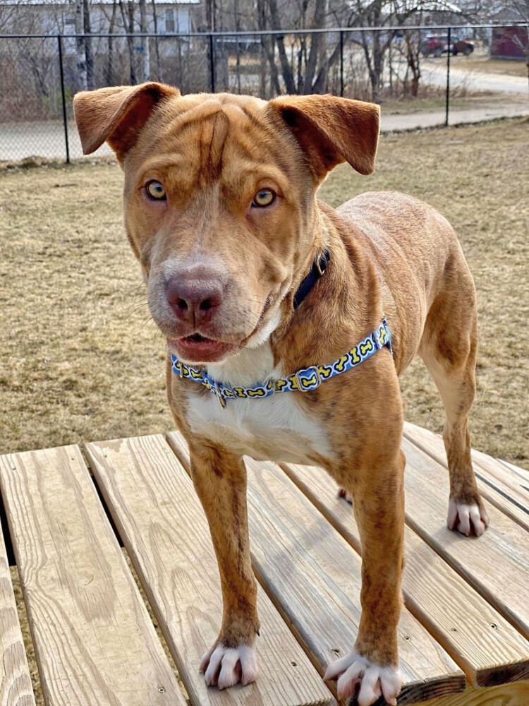 Meet Kersey. He is a Shar Pei/mix breed dog. The Shar Pei breed is known for its wrinkles. Kersey has some of those wrinkles on his head and throughout his brindle coat.