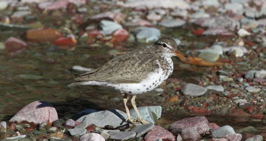 The Spotted Sandpiper (photo Glacier NPS) is another migrant from South America. However, it nests in our area in bogs and marshy areas around ponds and rivers. This bird is unique in a number of ways. First, during nesting season, roles are reversed between males and females compared to other birds. The females are the first to arrive and are larger and more aggressive in defending territories. Also, blood tests have shown that the males have higher than expected hormones associated with parental care. Second, this bird is easy to identify when you see it because it pumps it’s rear up and down in a teetering fashion as it walks, probing mud and the shoreline. This teetering behavior has led to a local nickname that I can’t write here. But you can probably guess it, if you are lucky enough to see this little teeter this spring.