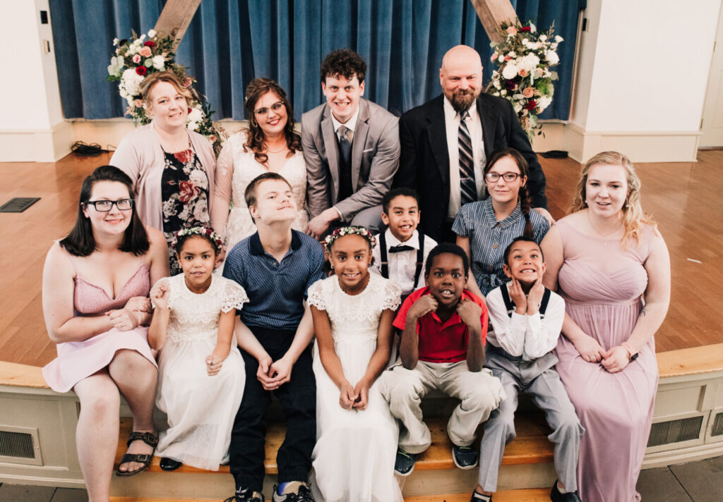 Ken and Roxanna “Rockie” Decker of Farmington have two biological children and have taken in numerous foster children over the years, adopting seven of them. The blended family poses at a wedding in March. Submitted photo
