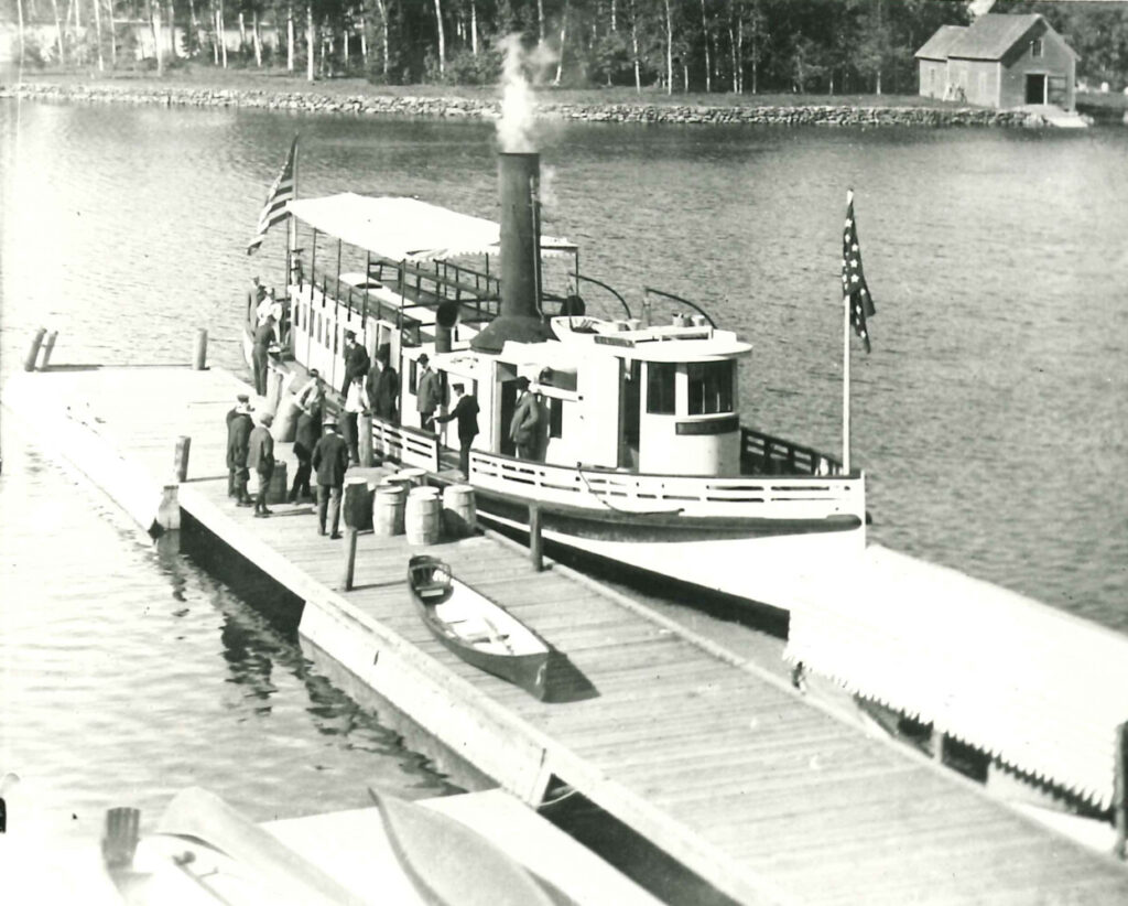 Steamer Rangeley at Mountain View House in Oquossoc Cove. The boathouse in the background at Indian Point is still standing!