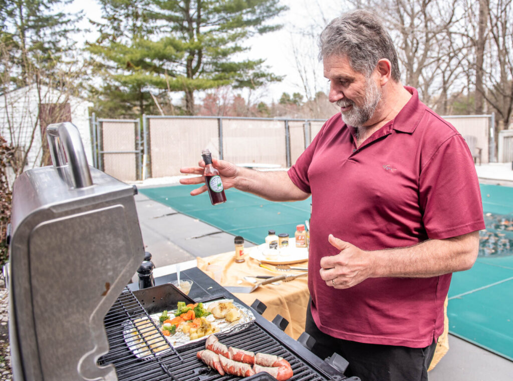 Dan Caron, Green Ladle chef, adds some Green Ladle branded raspberry dressing to a couple of grilled kielbasa links he is grilling on his outdoor grill in Auburn on Tuesday afternoon. Andree Kehn/Sun Journal Buy this Photo