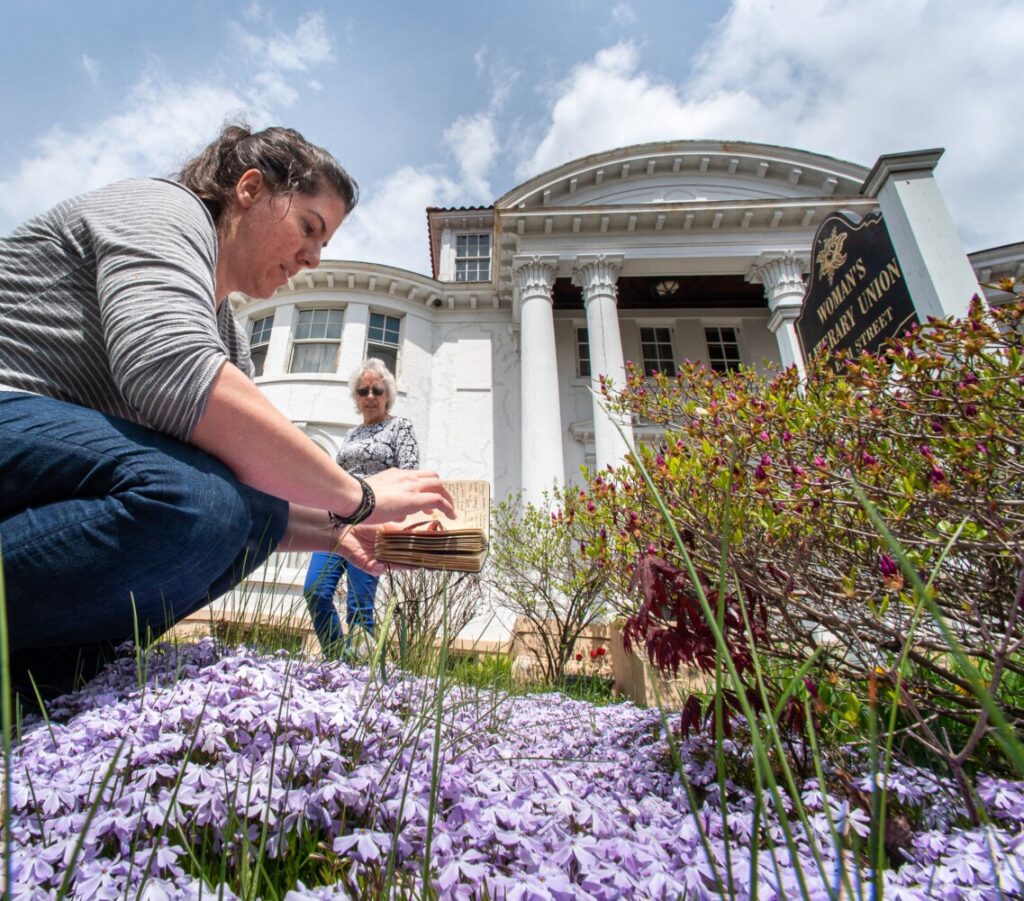 Jessica Jordan places a leaf from a Japanese maple tree in her collection book Sunday afternoon in front of the Woman’s Literary Union in Auburn as her mother, Woman’s Literary Union President Doreen Jordan, picks up trash. Jessica dries the pressings then uses rosin and molds to create necklaces and coasters for sale in a Boston shop as a hobby. She grew up in the area and is visiting family and friends. Russ Dillingham/Sun Journal Buy this Photo