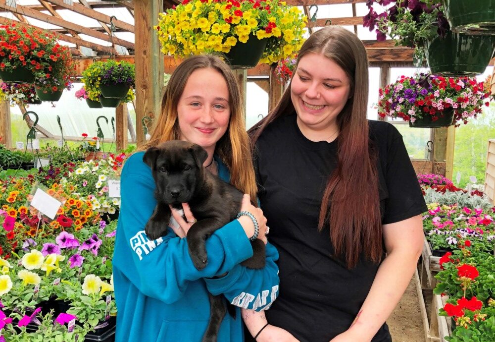 Crestholm Farm Stand employees Frances Boutilier of Oxford (left) and Haileigh Oakes (right) of South Paris take a break during a busy day of seedling and flower sales with Luna, a nine-week-old Sharpei/Labrador mix. Luna belongs to Oakes’ sister and was visiting the Oxford farm. Nicole Carter / Advertiser Democrat