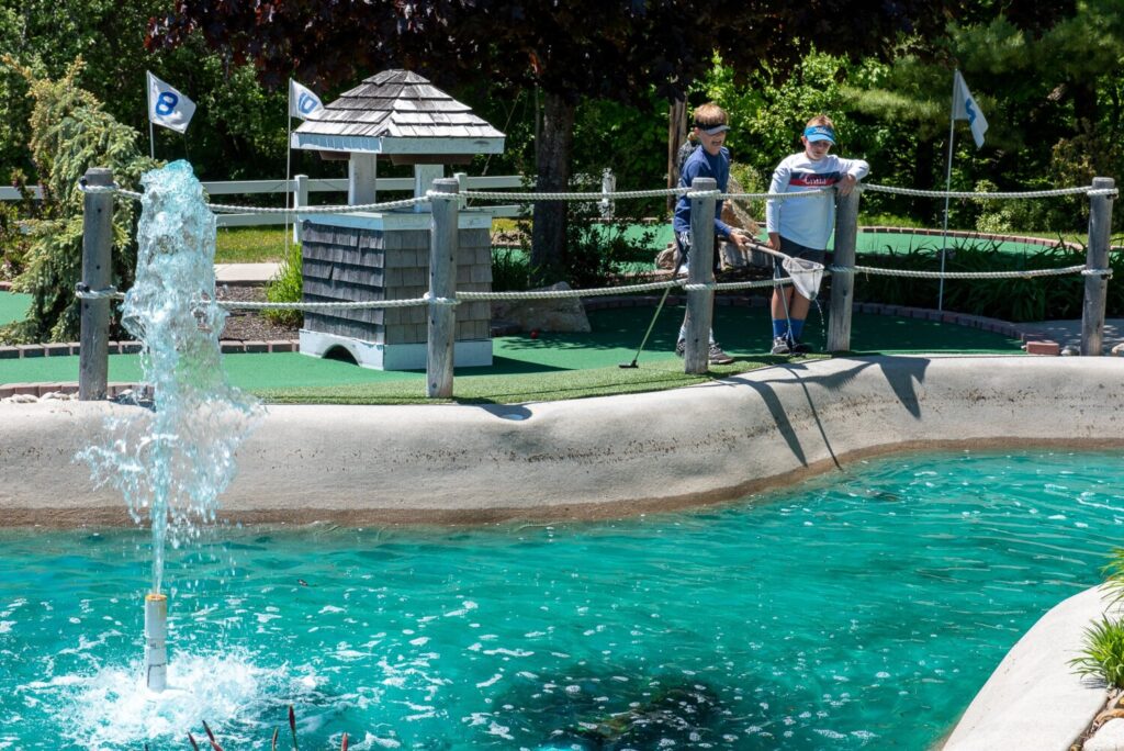 Carter Blenager, right, watches his friend, Caiden Strout, fish his ball out of a water hazard Tuesday afternoon at Tabers Restaurant, Miniature Golf & Driving Range in Auburn. The boys, both from Auburn, were with Carter’s grandmother playing on the course for the first time this year as the entire facility is finally able to fully open, with a few restrictions in place. Russ Dillingham/Sun Journal Buy this Photo
