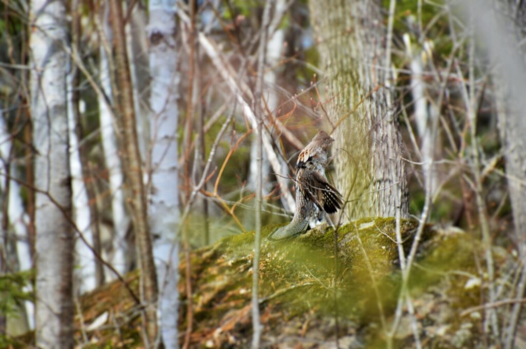 Drum roll, please! Low whirring can be heard from wooded hideaways as the male ruffed grouse performs his drumming dance to attract a mate. It is said that the ruffed grouse returns to the same rock or log for several years. Maria Holloway