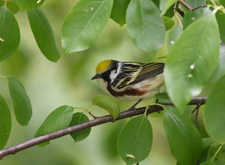 At my house in Albany, this is one of the most common warblers I hear at this time of the year. I’m surrounded by secondary growth of poplar, beech, birch and maple mixed with white pine, hemlock and spruce. This type of mixed forest is perfect for this little warbler. At Valentine Farm, walk the grass path along the edge of the old corn field and you will often hear the Chestnut-sided Warblers singing from the scrubby field edges. Listen for a musical, “Please, please, pleased to Meet-cha!”