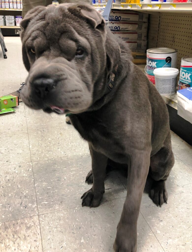 Beema the Sharpei scored a complimentary bone while visiting Paris Farmers Union in South Paris last Friday. Nicole Carter / Advertiser Democrat