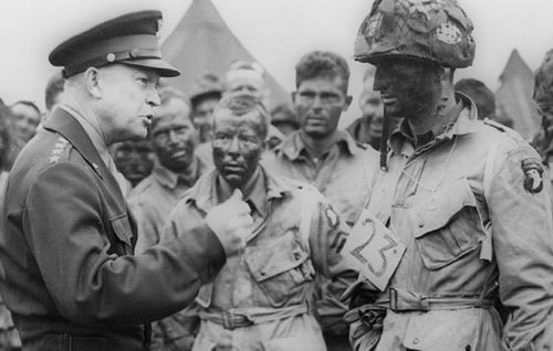 General Eisenhower talking with paratroopers of the 101st Airborne about fly fishing just prior to their jump into Normandy.