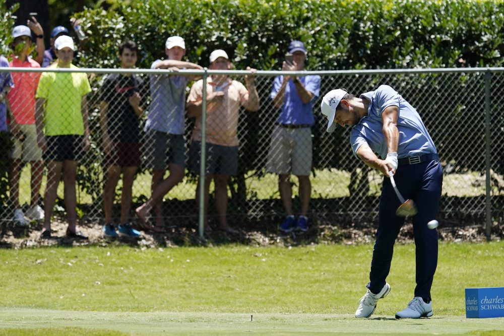 Xander Schauffele tees off on the second hole during the third round of the Charles Schwab Challenge golf tournament at the Colonial Country Club in Fort Worth, Texas, Saturday, June 13, 2020. (AP Photo/David J. Phillip)