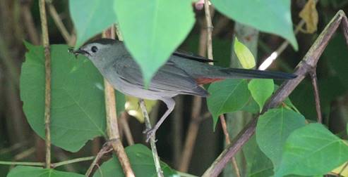 Bubbling tweets, chirps and gurgles floated out of a wedge of dense scrub and shrubs along the road. Occasionally, I recognized part of a song from another bird. Then, I heard a mewing sound like a cat, but the singer quickly moved on improvising so that it seldom repeated the same note. I could see the shadow of bird, a little smaller than a robin, moving in the undergrowth. Suddenly, a dark gray bird popped out of the tangle and perched on a low vine. It sported a dark cap and when it turned, I could see a rusty, dull red color under its tail. This was a Gray Catbird. (Photo by fishhawk.)