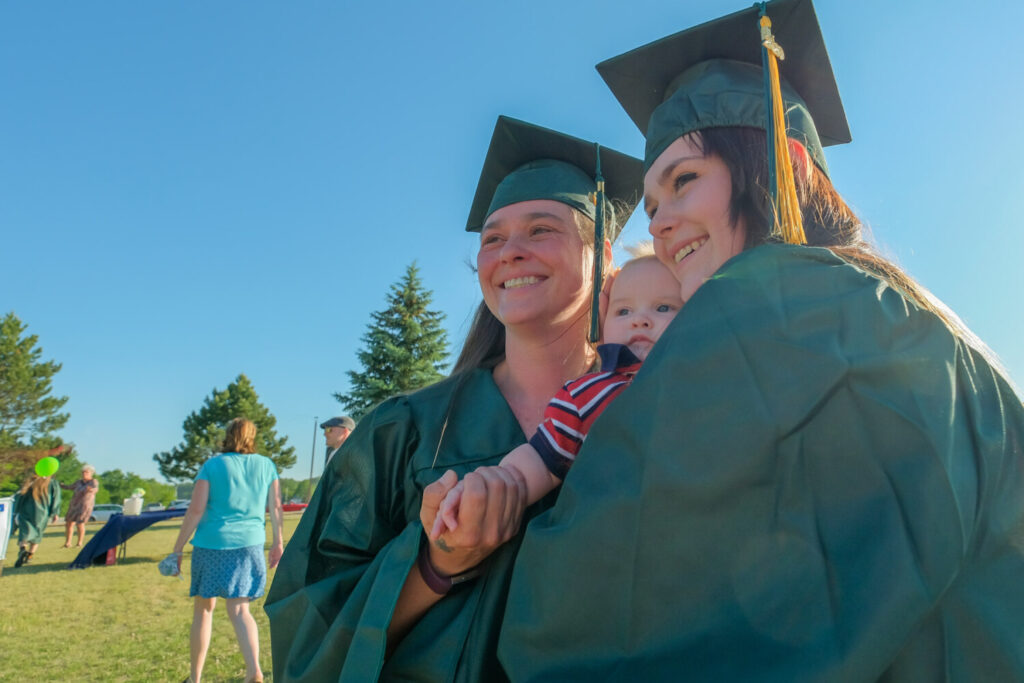 Mother Maria Walker, left, poses for a photo with her daughter Brianna Mason and Mason’s son Ryder after Oxford Hills’ Adult Education graduation ceremonies held last night in South Paris. Mother and daughter graduated, both finishing their high school careers together. Brewster Burns