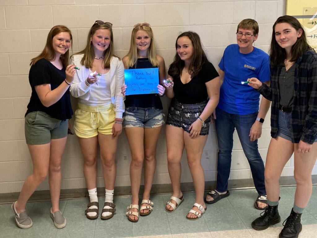 They are class officers and class representative Megan Godbout, Cecelia Dieterich, Abby Taber, Michele Wilson, Tina Fox- Rotarian, Rachel Chase with their flashlights. Submitted photo