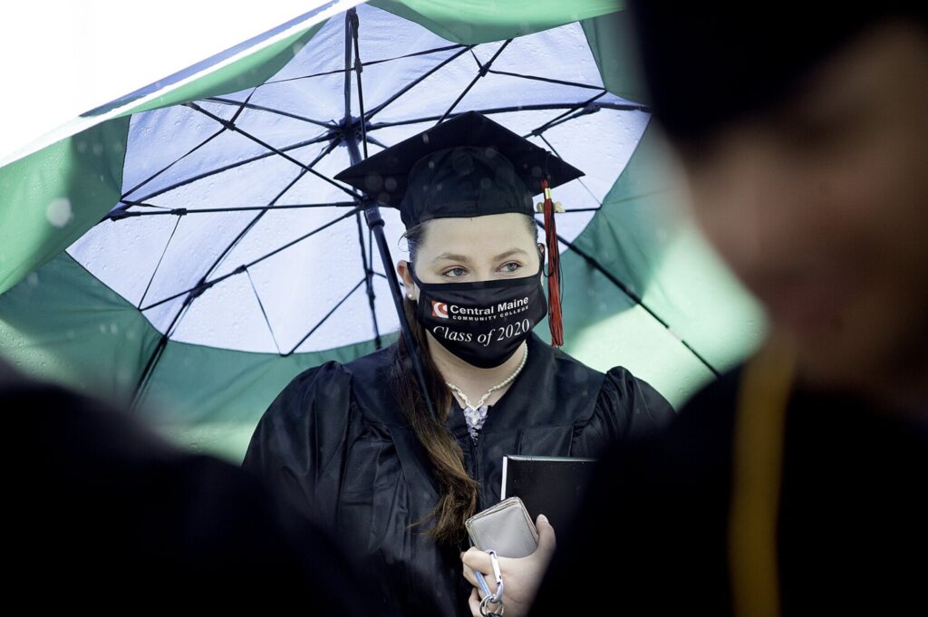 Alexandra Sult of Lisbon waits to have her picture taken Tuesday during The Great Class of 2020 Regalia Pickup Day at Central Maine Community College in Auburn. Sult and other students from the Class of 2020 came back to campus for the first time since the college closed in March due to the COVID-19 pandemic. Graduates picked up their graduation cap, gown, degree and CMCC Class of 2020 face mask before posing for pictures that will be part of a commencement video. It will replace a live graduation ceremony. Sult is a 2017 graduate of Lisbon High School. She graduated from CMCC with a certificate from the Physical Fitness Specialist Program and plans to return in the fall to study law enforcement. Daryn Slover/Sun Journal Buy this Photo