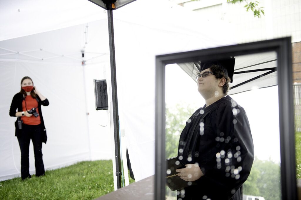 Chance Warren of Lewiston waits to have his picture taken Tuesday during The Great Class of 2020 Regalia Pickup Day at Central Maine Community College in Auburn. Warren and other students from the Class of 2020 came back to campus for the first time since the college closed in March due to the COVID-19 pandemic. Graduates picked up their graduation cap, gown, degree and CMCC Class of 2020 face mask before posing for pictures, which will go into a commencement video that is replacing the actual graduation ceremony. Warren graduated from Lewiston High School in 2016 and earned his certificate in culinary arts from CMCC. He plans to return in the fall to work toward his associate degree in culinary arts. Daryn Slover/Sun Journal Buy this Photo