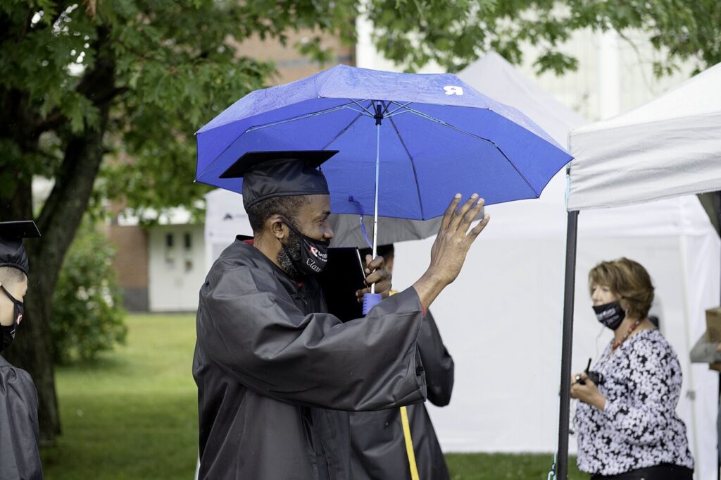 Abel Bisabu of Lewiston waves to staff Tuesday after having his picture taken during The Great Class of 2020 Regalia Pickup Day at Central Maine Community College in Auburn. Bisabu and other students from the Class of 2020 came back to campus for the first time since the college closed in March due to the COVID-19 pandemic. Graduates picked up their graduation cap, gown, degree and CMCC Class of 2020 face mask before posing for pictures that will be included in a commencement video in place of an in-person graduation ceremony. Bisabu, a native of Angola, graduated with a business administration degree. Daryn Slover/Sun Journal Buy this Photo