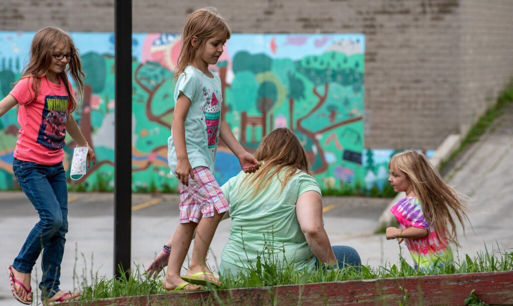 Makenna Simonds, left, walks across a flower bed beam on Birch Street in Lewiston on Wednesday morning with her sisters, Arabella Swan, center, and Aspen Swan, right, while their mother, Samantha Swan, watches. The family had just returned from picking up lunches at Connors Elementary School. Russ Dillingham/Sun Journal Buy this Photo