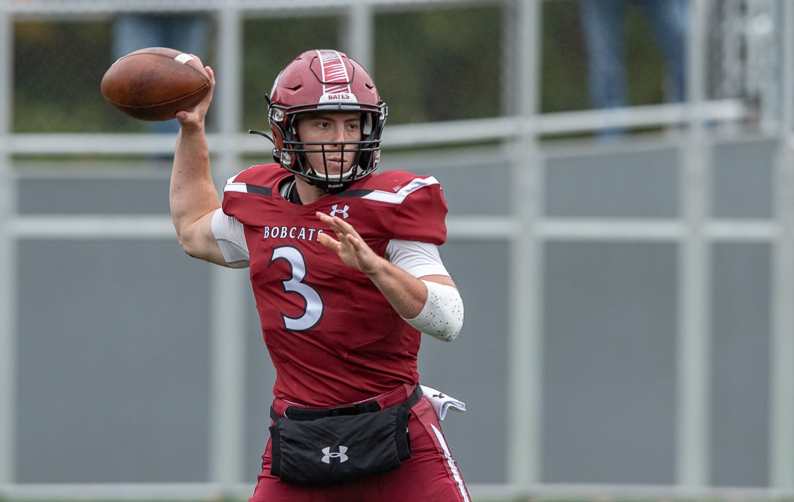 Bates quarterback Brendan Costa winds up for a pass against Trinity at Garcelon Field in Lewiston last October. The Bates fall sports teams will be able to practice, but the status of games is unknown. Russ Dillingham/Sun Journal Buy this Photo