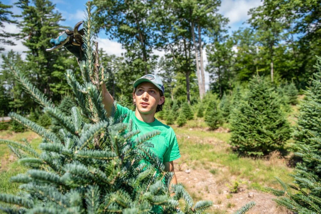 Carter McPhedran trims the top shoot of a Christmas Tree at Spencer Family Tree Farm in Wayne on Thursday. McPhedran graduated from Maranacook High School this past spring and has been helping his friends with their tree farm while waiting to go to Middlebury College in February. Andree Kehn/Sun Journal Buy this Photo