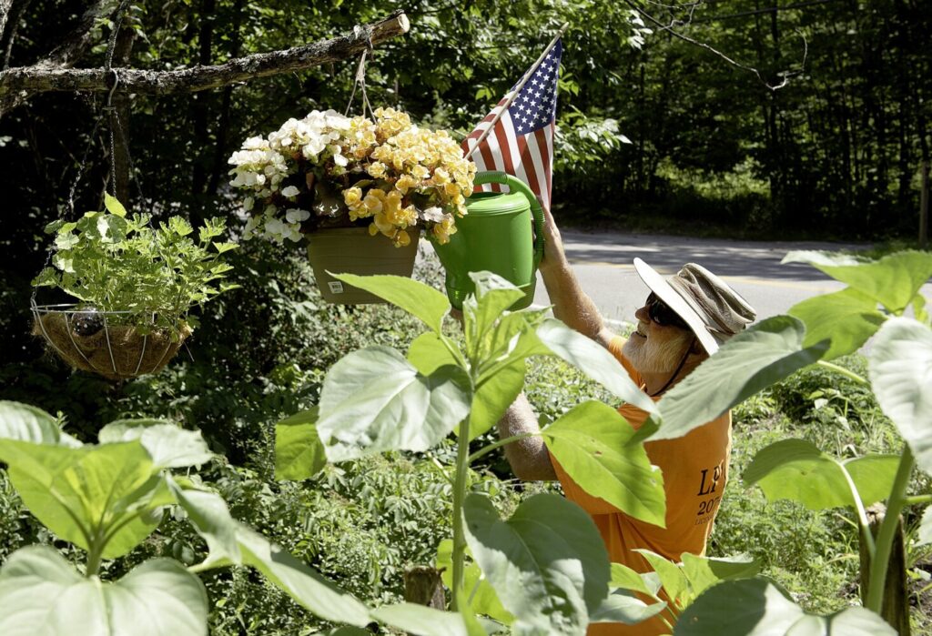 Terry Mikesell waters flowers at his home in Auburn on Monday. “It’s been a good year, but you have to be attentive,” he said. He waters his plants almost daily with rainwater that runs from his roof into a collection barrel. “Stuff has been growing like crazy,” he said. Daryn Slover/Sun Journal Buy this Photo