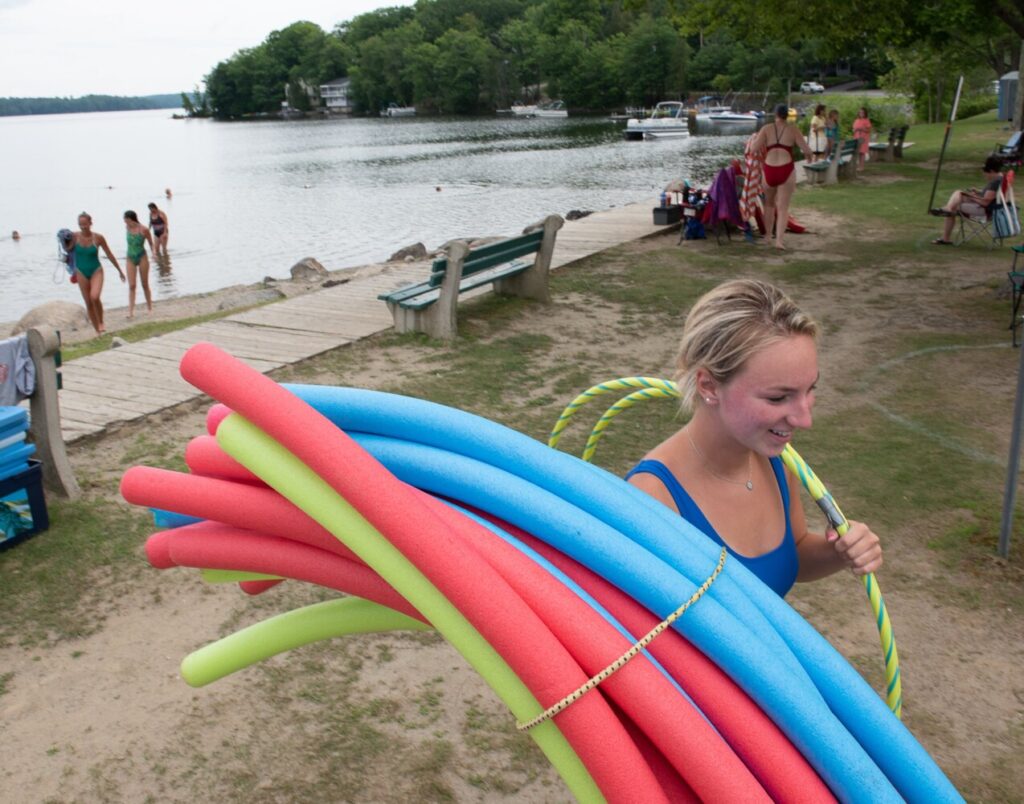 Alexis Emery of the Winthrop Recreation Department cleans up Tuesday afternoon after swimming lessons on Maranacook Lake. Smaller and more-individualized lessons, along with circles drawn all over the grass, are some of the precautions being used for groups to social distance. Everyone entering the town beach must have his or her temperature taken. Russ Dillingham/Sun Journal Buy this Photo