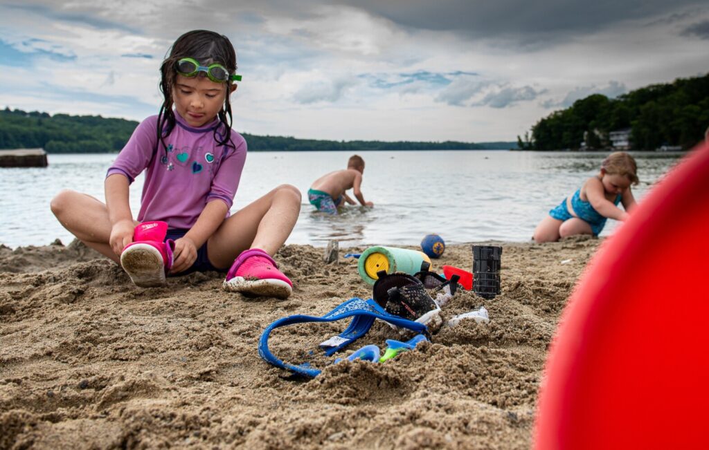 Raelynn Nadeau of Winthrop puts on her water shoes Tuesday afternoon after her swimming lesson with the Winthrop Recreation Department at the town beach. Everyone entering the town beach must have his or her temperature taken and must maintain safe social distancing. Russ Dillingham/Sun Journal Buy this Photo